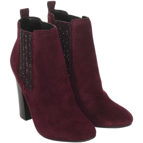 Bottines à talons hauts. couleur bordeaux Bout rond. Fabriqué en cuir effet suédé. Côtés avec finition élastique et strass brillants. Semelle intérieure en cuir customisée par la marque. Talon avec finition bois. Semelle en caoutchouc. Coutures apparentes assorties. Composition: Extérieur : Cuir et Textile. – Intérieur : Cuir et Textile.- Semelle : Synthétique. Plus d’informations:. Mesures du talon : 10 cm. Entretien: – Nettoyer avec un chiffon humide.